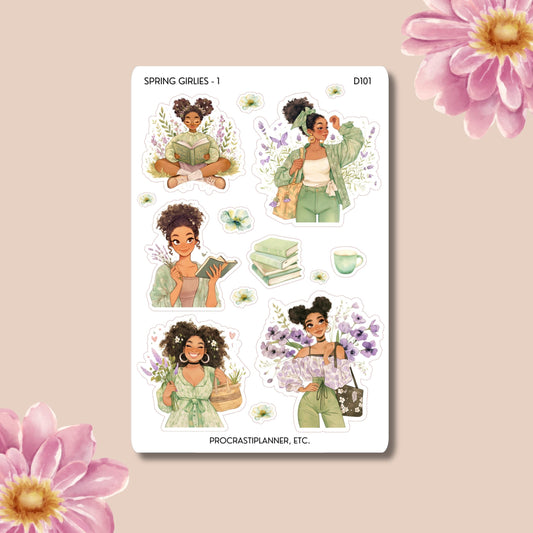 Spring Girlies Black Women in Floral Green and Yellow Outfits | Seasonal Aesthetic Stickers for Journals and Planners